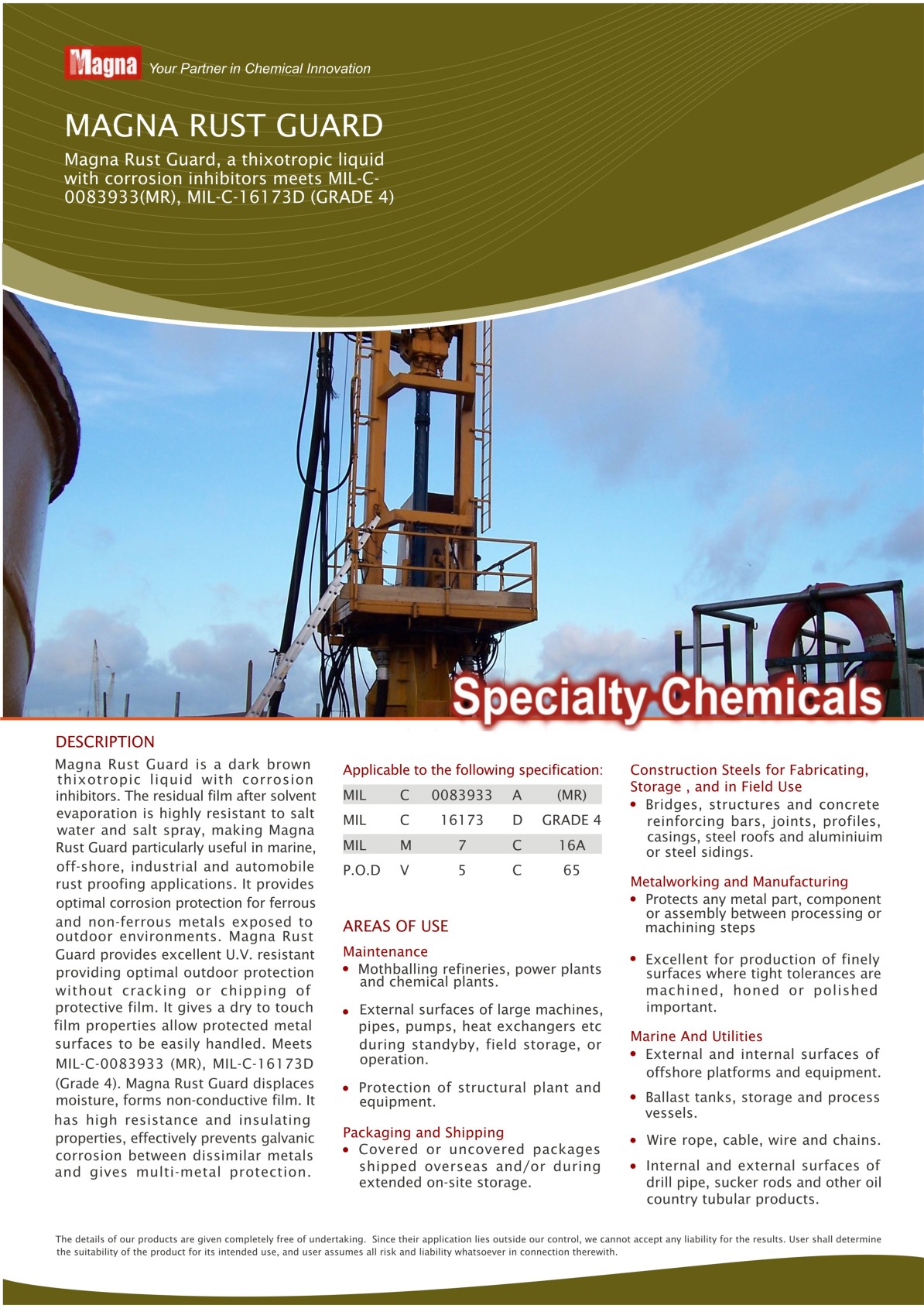 Magna Rust Guard, a thixotropic liquid with corrosion inhibitors meets MIL-C-0083933(MR), MIL-C-16173D (Grade 4)