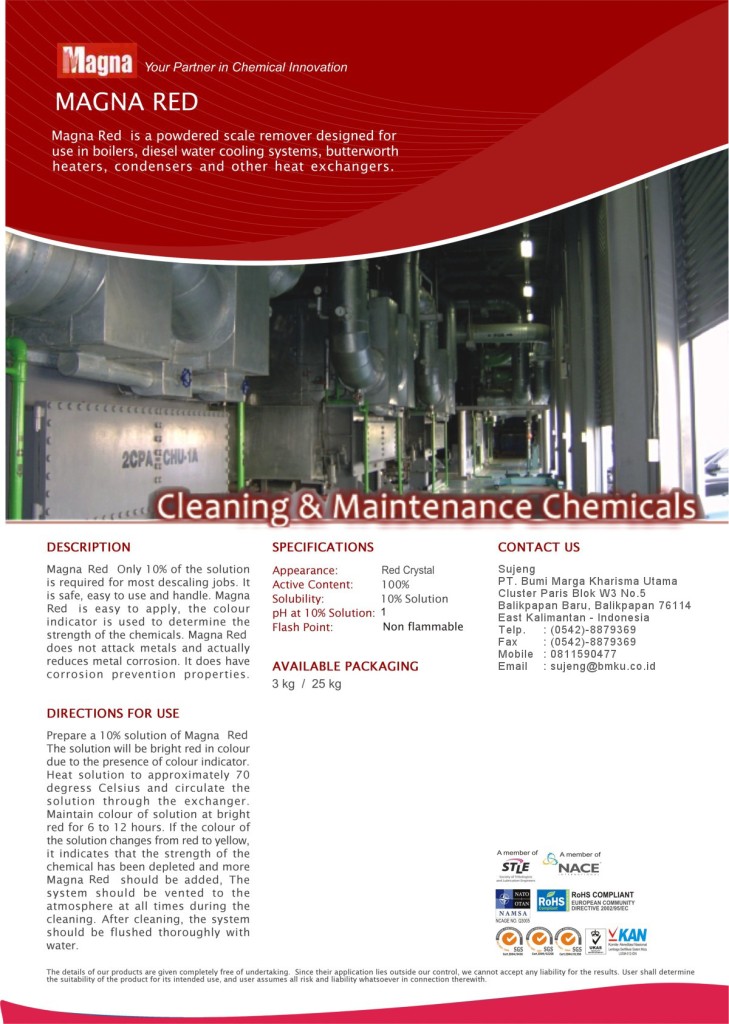 Magna Red is powdered scale remover designed for use in boilers, diesel water cooling systems, butterworth heaters, condensers and other heat exchangers.